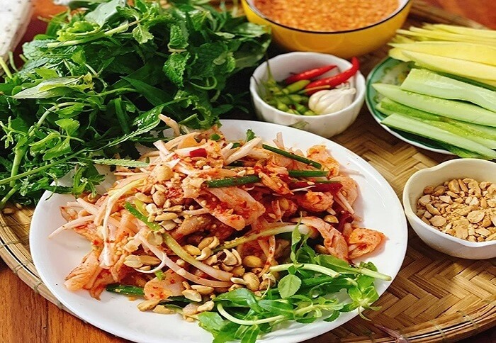 Phần thịt cá đã ráo nước sẽ được trộn đều với các loại rau củ thái sợi tươi ngon, tạo nên sự đa dạng về màu sắc, kết cấu và hương vị. Các nguyên liệu phổ biến bao gồm hành tây, dứa thái lát, cà rốt bào sợi, xoài xanh nạo sợi, dưa chuột thái lát mỏng, và chuối xanh thái lát mỏng. Sự kết hợp này mang lại vị chua, chát, giòn, ngọt tự nhiên, làm cân bằng vị béo của cá. Để tăng thêm độ bùi, béo và hương vị cay nhẹ kích thích vị giác, lạc rang giã nhuyễn (đậu phộng) và một chút ớt bột sẽ được thêm vào, trộn đều cùng các nguyên liệu khác. Khi thưởng thức, món gỏi không thể thiếu các loại rau thơm tươi sống đa dạng, đóng vai trò quan trọng trong việc tạo nên hương vị phức hợp và hấp dẫn.